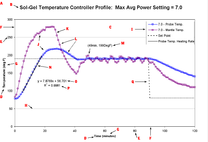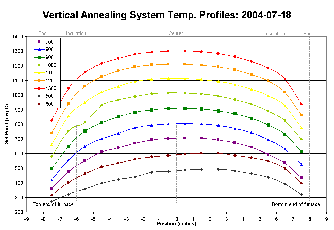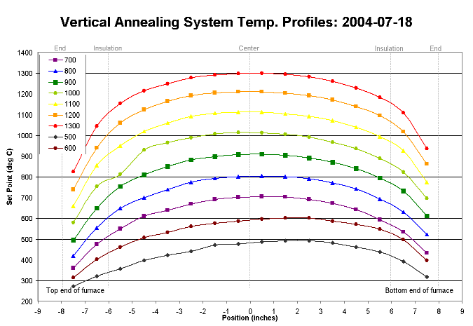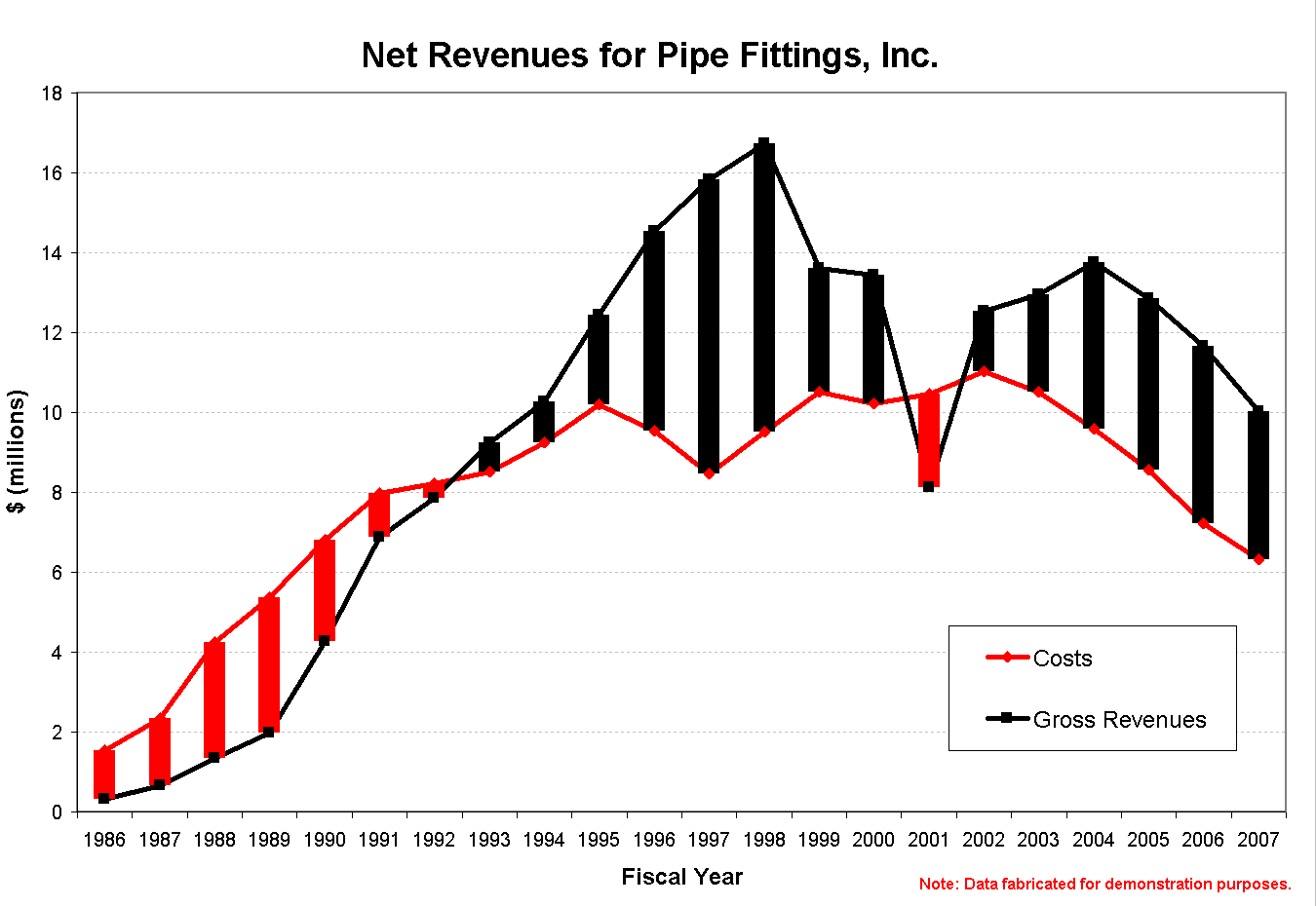 Data It may seem more appropriate to discuss data after acquisition, but in order to proplerly conduct an experiment--of which taking data is an integral part--proper planning is critical. Although, it may not be not that critical for putting together a really good graph. :-) On of the most common issues with data is significant digits. We will not go into this here, but extra digits after the decimal point indicate accuracy which is not there in data, and not necessary for axis scales (becuase it is imposed, not measured on an axis). How the data points are connected is also important. If 50 points were taken in 20 experiments, they should not be connected in one long series. But seldom should a graph have 20 series on it. Instead, a trend line(s) should be used. If a series of data typically fluctuates rapidly from point to point, as in a stock price, it should be connected with straight lines. (Observe the Net Revenues for Pipe Fittings, Inc graph below.) If a series typically moves gradually from point to point, as in a temperature profile, a smoothed curve should probably be used to connect the points. (See the Vertical Annealing System Temp. Profiles graph below.) If the data is not contiguous, however, DO NOT ever connect the dis-continuous points or series, this is too misleading to the viewer. While on the subject of trend lines, many times a set of data will demonstrate a trend of some sort--linear, assymptotic, x^n, polynomial, et cetera. When this is the case, it is often a very good idea to model the data to see just how good the fit is. If it is not expected, the trend line can be a light gray, on a backup slide, or just the equation and fit value can be placed somewhere unobtrusive. When a trend is expected, it is good form (especially in a lab class) to fit the data with the expected trend and examine how good the fit is or is not. If a completely different trend is observed--from what is expected--first analize you data manipulation and graph to ensure no mistakes have been made before you continue with the error analysis of your experiment. Trend lines are sometimes used to prognosticate beyond the data set. [As an aside, this is technically referred to as "extrapolation". Extrapolation, however, is generally done for "future" data within some percentage distance of the main data range (up to 30% prior to or beyond the current range, for example). Prognostication in this sense refers to estimating trends beyond 30% of the current data range.] When data is used to prognosticate, it must be made very clear, both with a text label of some kind (i.e. "Expected 4th Quarter Earnings") and with a viusual cue (color change or bright drawing element). Lastly, be very careful with the use of drawing elements, point labels,
