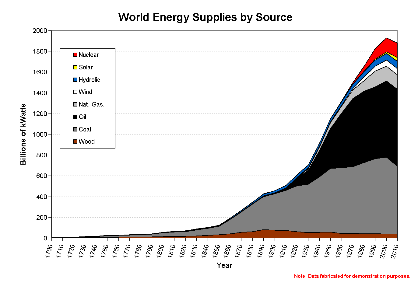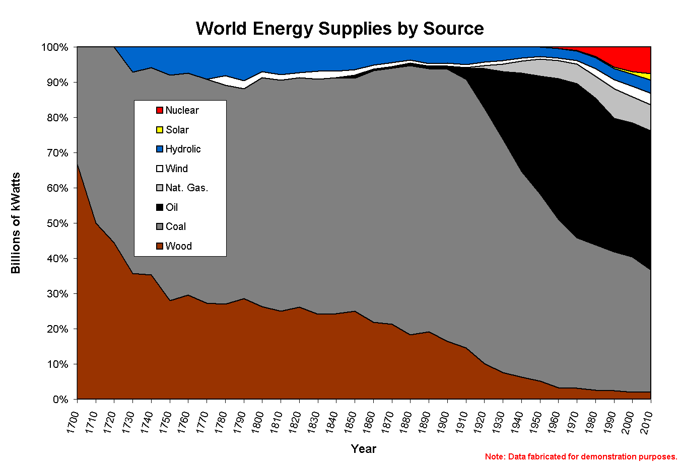 Data & Line Format (Multiple plots) Many graphs have more than one series of data plotted. Some effort must be made to permit the viewer to easily determine the difference between these different data series. This may be accomplished through the use of different types of data markers, colored plot lines, patterned plot lines, shaded/colored areas, and drawing elements. Of course, a combination of these will work well, all of which require a legend on the graph. Due to the popularity of MicroSoft Excel and users' willingness to let the graphing "wizard" control the output, the most common multi-plot distinction mechanism is a combination of data marker type and plot line color. On screen, this works out fine (color choices aside), but for increasing numbers of series it quickly breaks down to data marker type. [This is still hard for the viewer, because the wizard goes through a series of marker types with gradual changes, i.e. solid square to solid triangle, not dramatic changes such as solid square to open cirle to cross.] The difficulties are rather marked when printing in black and white. In order to anticipate B&W output and other unforseen issues, care should be taken to creae series plots which are distinctive in several ways, if possible. In the Effect of Employee Dress on Sales graph, different plot line colors are used, as are different data point markers. It would have been even better if the plot tracing the number of employees wearing ties had hollow markers and a dashed plot line. However, the drawing elements really help out in this respect, so it is probably not too big an issue for most viewers printing in balck and white. With few or many series, it is helpful to include a trend in the variation used to aid the viewers' ability to distinguish between series and identify trends. In the Effect of Employee Dress on Sales graph, the data plot is black and the sales plot is green (like American dollars). A similar trend is used in Net Revenues for Pipe Fittings, Inc., where red signifies a loss for the year and black indicates a profit for the respective year. In the Rapid crystallization of MOCVD Al2O3 and particularly in the Vertical Annealing System Temp. Profiles graphs, color is used to denote the relative temperature at which successive readings were taken. In these two, lower temperatures are denoted by by cooler colors (black, blue) and higher temperatures by warmer colors (yellow, red). [As an intellectual note, this order does not reflect the true order of visible radiation given off by heated materials. Emission of visible radiation typically begins around 700 degrees C with red and progresses to red-orange, orange, yellow, white, white-blue, blue.] The choice of how to distinguish between series plots yet show a smooth progression will often require a delicate touch. The balance between contrast and closeness, what is pleasing to the eye yet still easily distinguishable is estimable, but subjective. The best method is to use known associations and trends. One typical trend is temperature: red/hot to yellow/warm to blue/cold. For a plain ordered series without an obvious association, one could easily use early/light gray to now/medium gray to future/black, using time/grayscale as an example. Some graphs are strictly associative. For a biomass graph the associations might be along the lines of Table 2, below. In the World Energy Supplies by Source graphs--absolute and percentage--the legend shows another set of associations, listed in the Table 3, below.