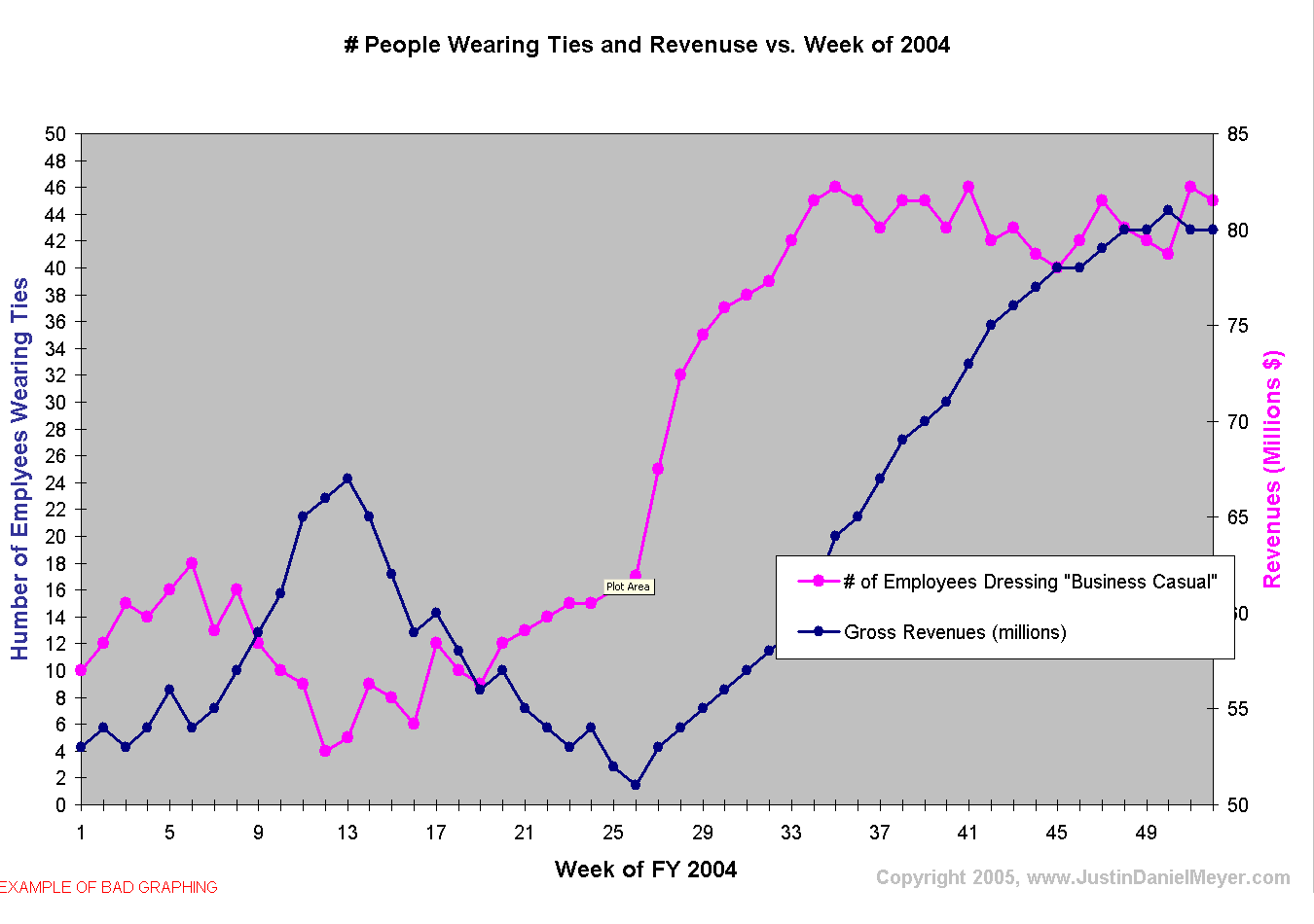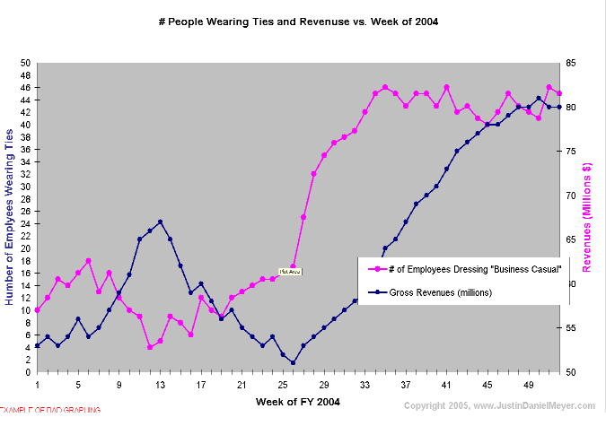 following questions: For example, let us take a look at the # People Wearing Ties and Revenues vs. Week of 2004 graph below as a rough draft of a presentation slide to the Executive Committee for Salary and Employee Morale. To show the Committee that more sales occurred when employees were dressing "business casual" is pretty straight forward, but keeping the past material in mind, we can come up with the following items to work on: Title Left y-axis (#1) X-axis Right y-axis (#2) Plot area Series Audience / Clarity Implementing changes to eliminate these issues results in a slightly more polished version, the Effect of Employee Dress on Sales Revenues: FY 2004 graph.